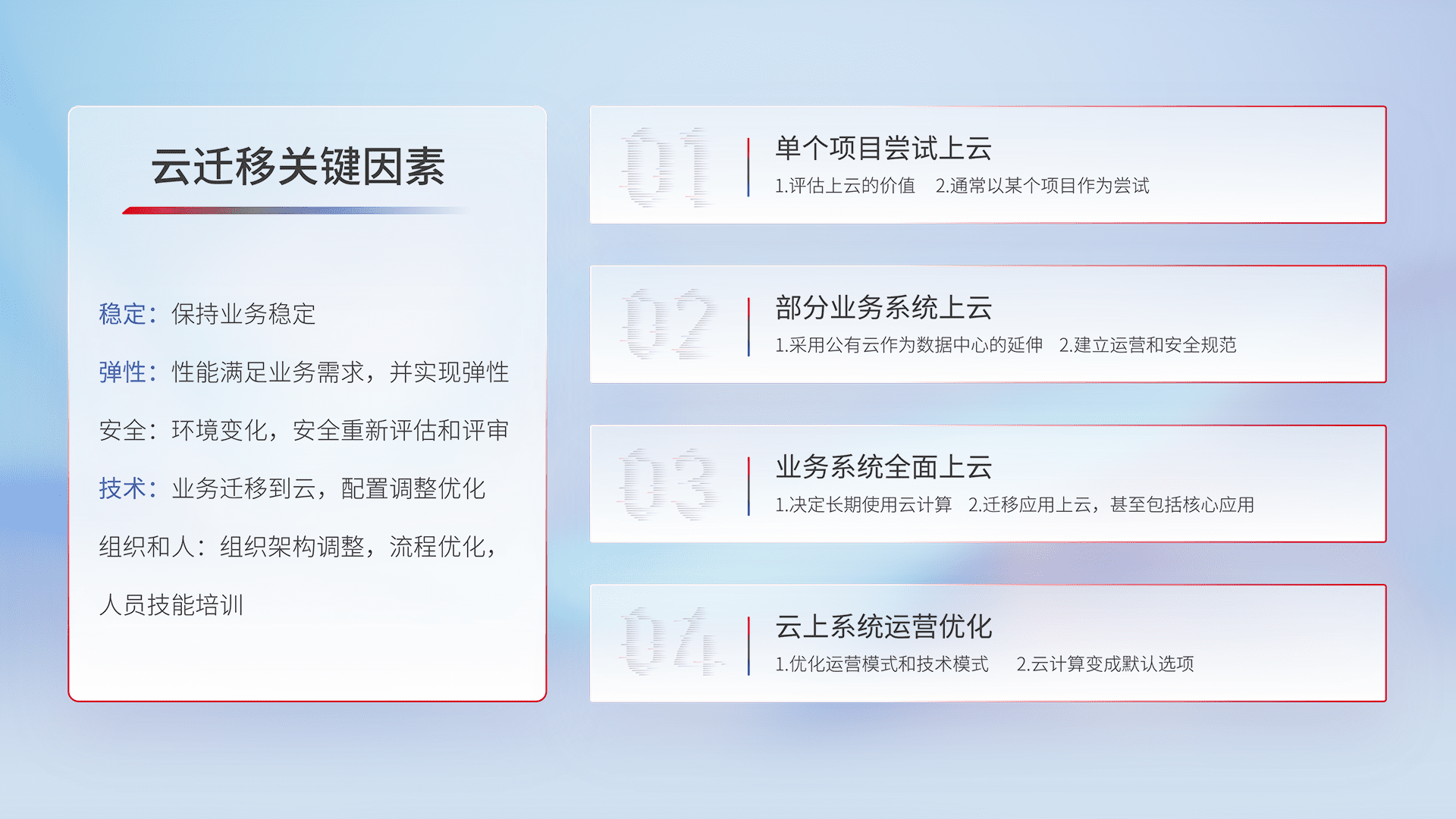 结合实际业务,,从规划设计、、、云平台选型、、、云原生改造、、、、数据迁移、、集成交付,,迁移全过程为客户识别最佳上云路径,,做好风险识别管理,,设计网络架构、、、、身份权限、、、、安全审计合规、、操作审计、、日志审计、、、、监控告警策略、、、多站点容灾设计等,,,对云上基础设施进行整体规划,,,提升IT治理水平,,以满足弹性、、高可用、、高性能的需求。。