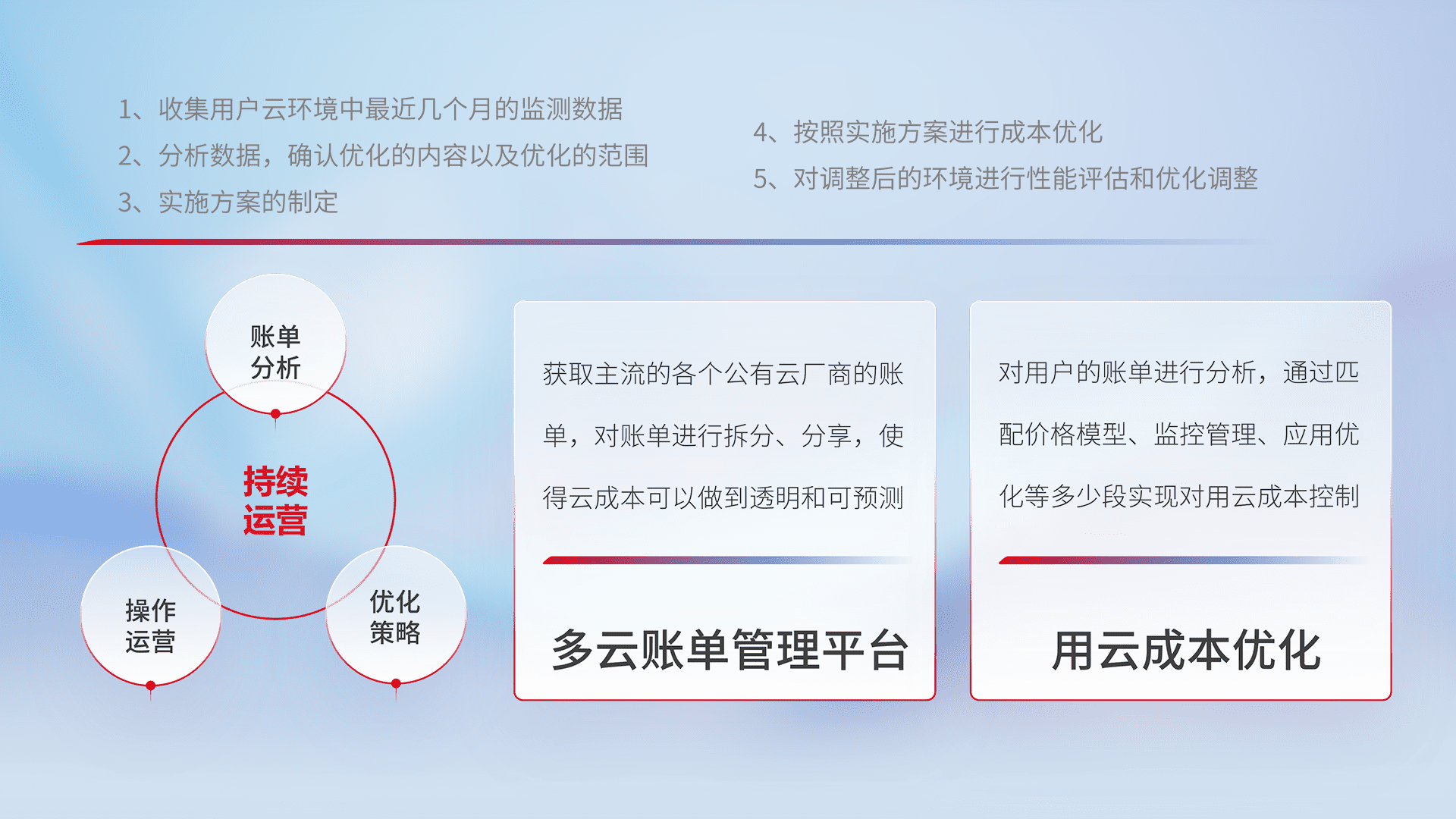 通过多云纳管,,,,以统一的资源数据模型把客户的云资源进行抽象和封装,,,,进而实现对多云资源的统一操作,,,保障云资源管理的可靠性、、、稳定性与可用性。。。量身定制化运维内容,,,,配置、、开发运维、、、补丁管理、、、备份、、监控、、认证和访问管理、、、审计和日常巡检等,,保障在用云过程中的可靠度,,稳定度以及高可用率。。。。